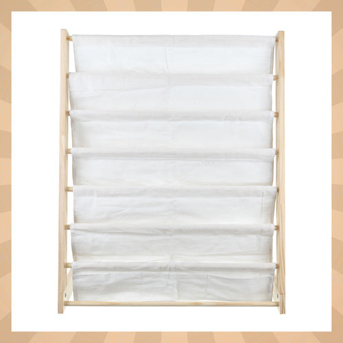 📚 Alt på sin plads – uden rod De 6 rummelige stofhylder giver masser af plads til bøger, hæfter og legetøj. Dit barn kan nemt se og vælge, hvad det har lyst til at læse eller lege med.