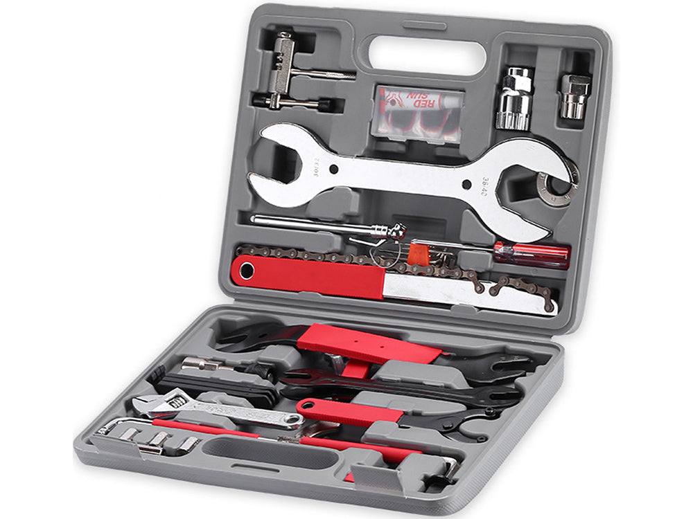 Dette komplette sæt inkluderer alt fra skruenøgler og unbrakonøgler til kædeværktøj og reparationsudstyr. Det gør det nemt at håndtere alt fra små justeringer til større reparationer. Perfekt til både begyndere og erfarne cykelentusiaster.