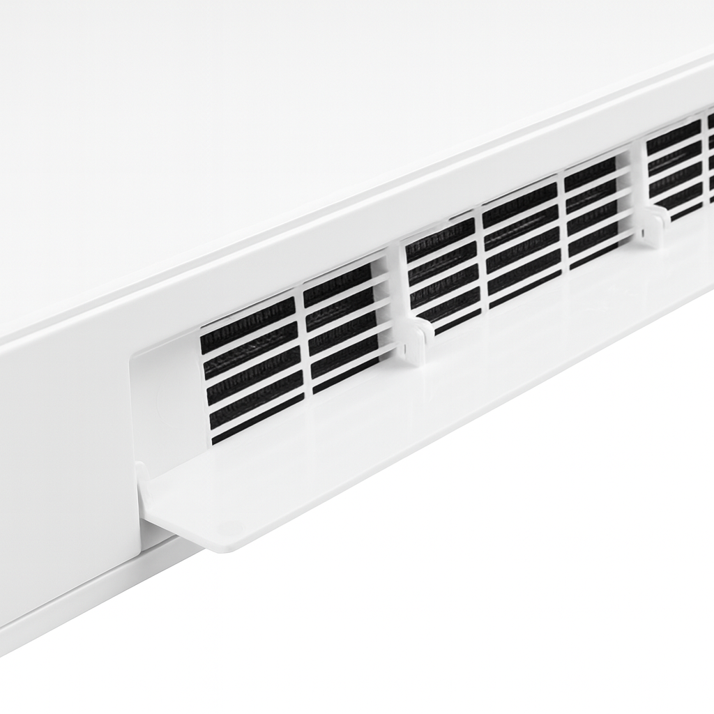 🌬️ Flere Driftsformer & Oscillerende Lameller Vælg mellem ventilator, varm luft eller meget varm luft, og nyd jævn varmefordeling med brede, oscillerende luft lameller.