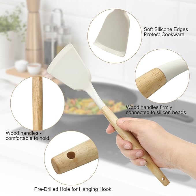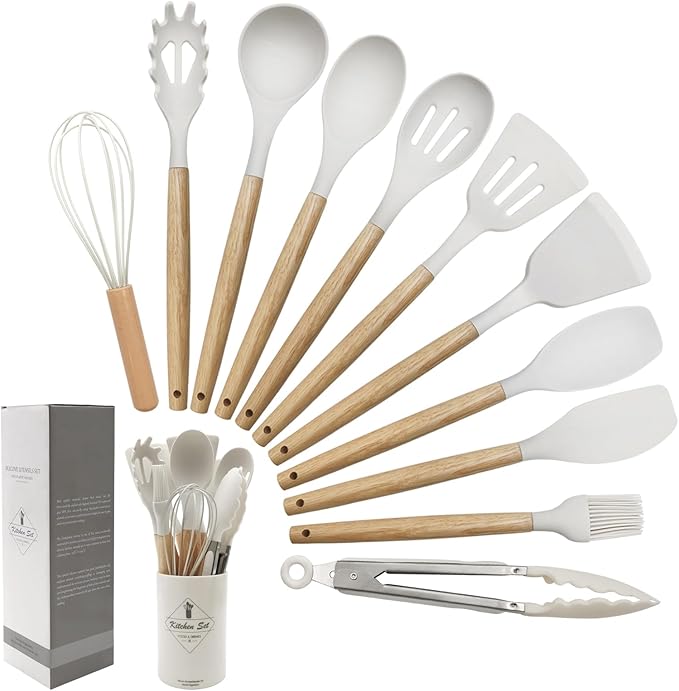 Redskaberne er lavet af premium non-stick silikone, der er holdbart og BPA-frit, hvilket sikrer sikker kontakt med mad. Silikonen er skånsom mod dine pander og potter og nem at rengøre.
