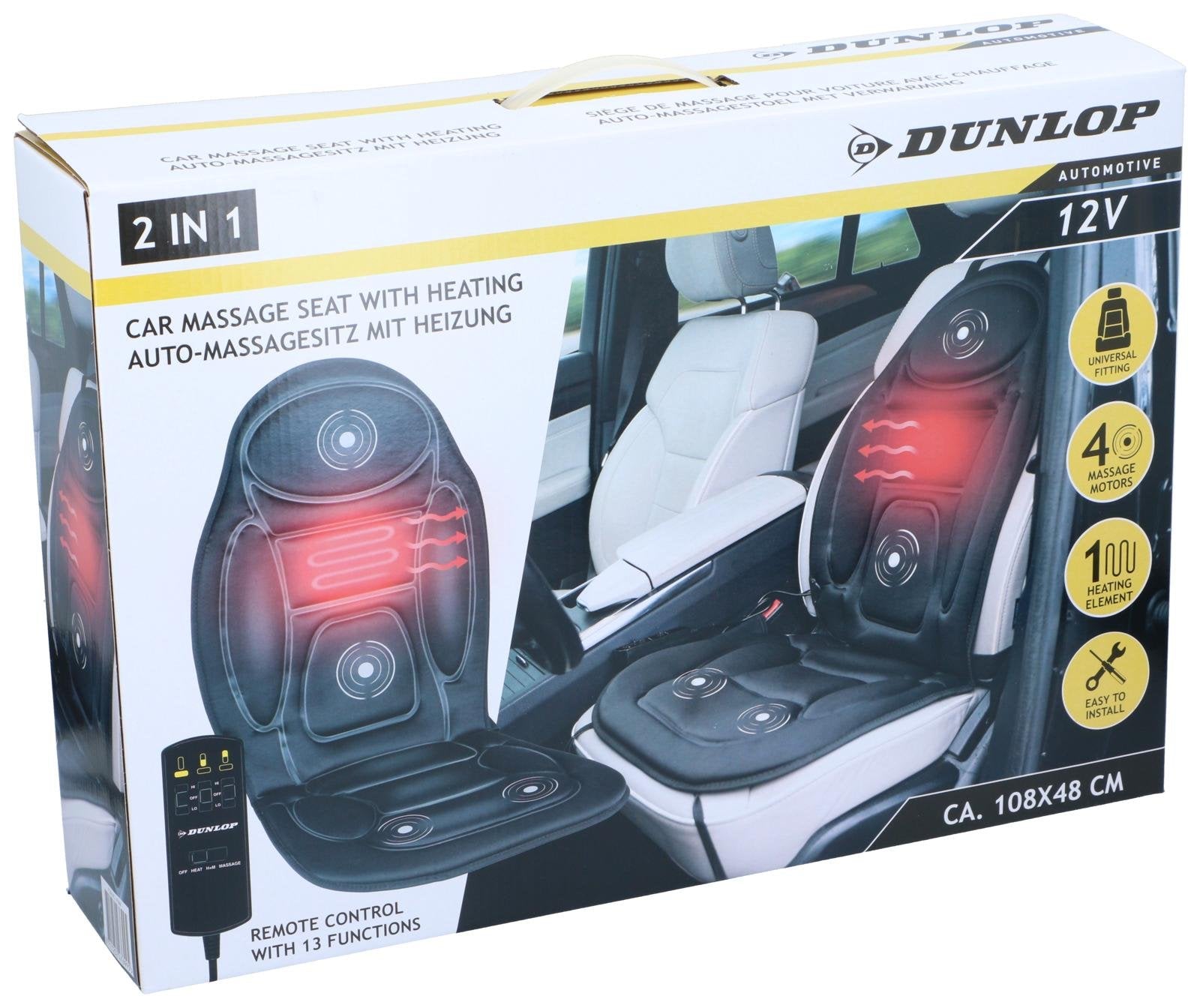 Gør dine køreture mere behagelige med dette "DUNLOP Massage- og Varmebetræk til Bilsæde", som kombinerer afslappende massage med en dejlig varmefunktion. Perfekt til både korte og lange ture, og ideel til dig, der ønsker ekstra komfort bag rattet eller som passager.