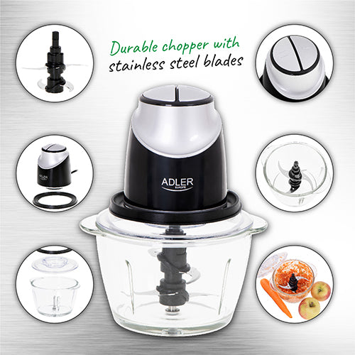 Gør madlavningen lettere med denne Køkkenhakker med Glasbeholder & 4 Rustfri Stålblade. Denne elegante og kraftfulde hakker er ideel til hurtig og effektiv hakning af grøntsager, frugt, nødder og endda små mængder is. Med et robust design og brugervenlige funktioner er den en uundværlig hjælp i ethvert køkken.