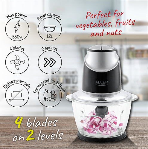 Gør madlavningen lettere med denne Køkkenhakker med Glasbeholder & 4 Rustfri Stålblade. Denne elegante og kraftfulde hakker er ideel til hurtig og effektiv hakning af grøntsager, frugt, nødde. . .
